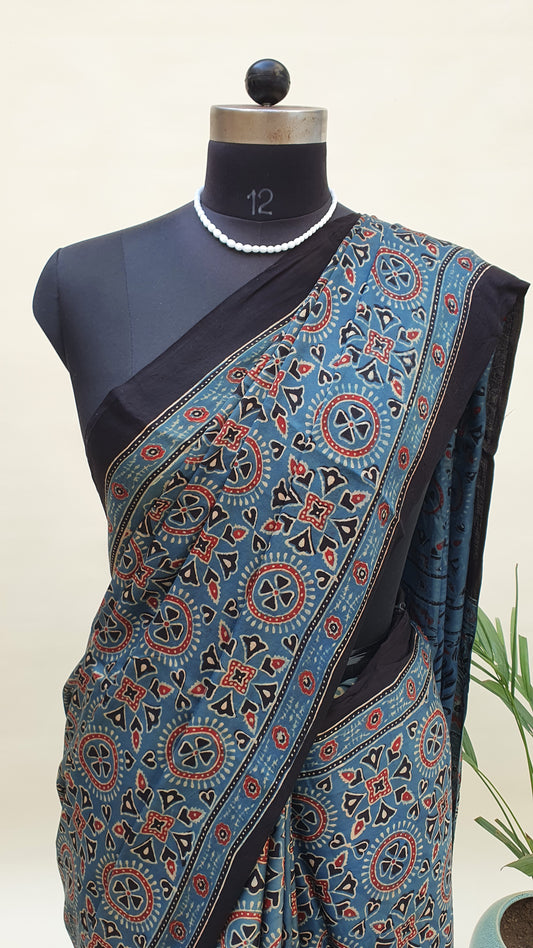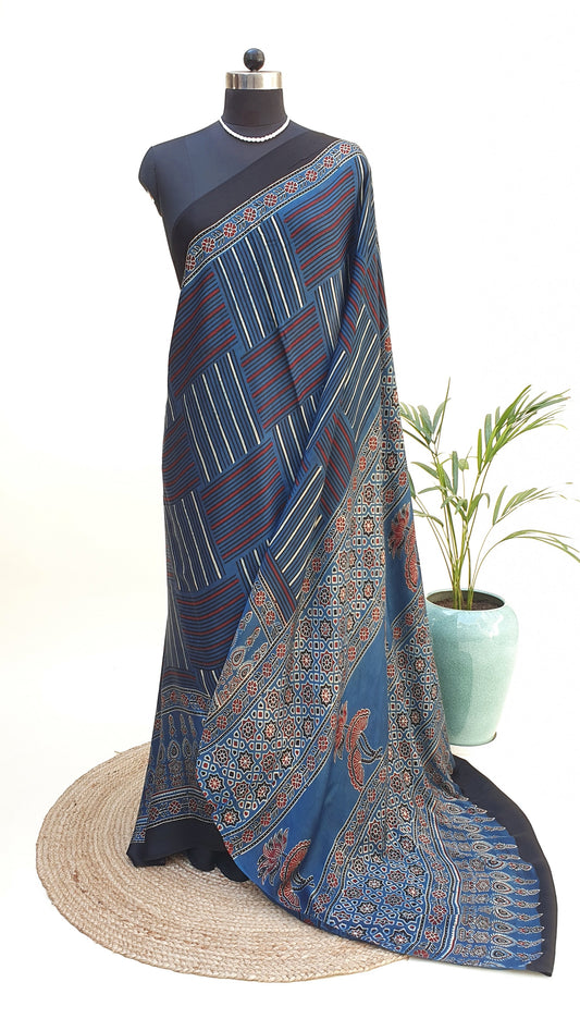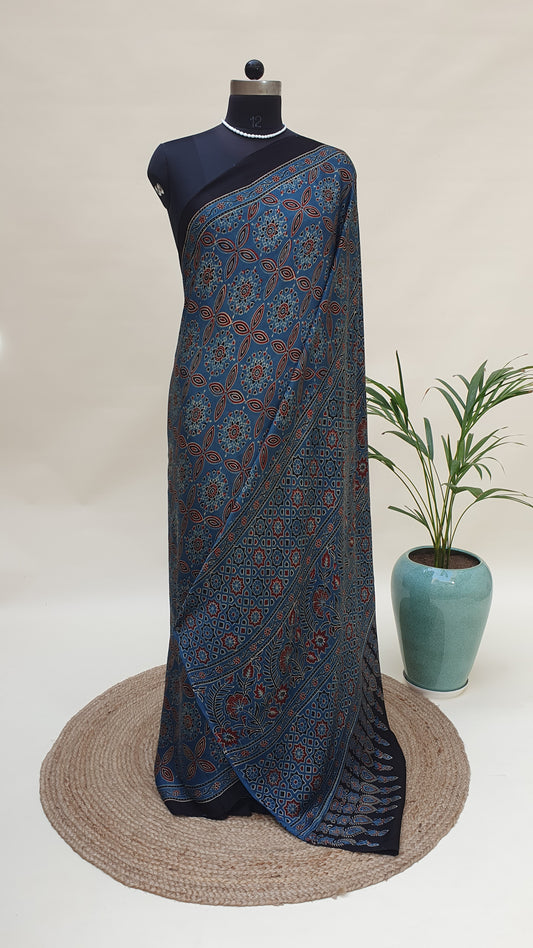 Opera Blue Ajrakh Modal Silk Saree MSAJ-0011
