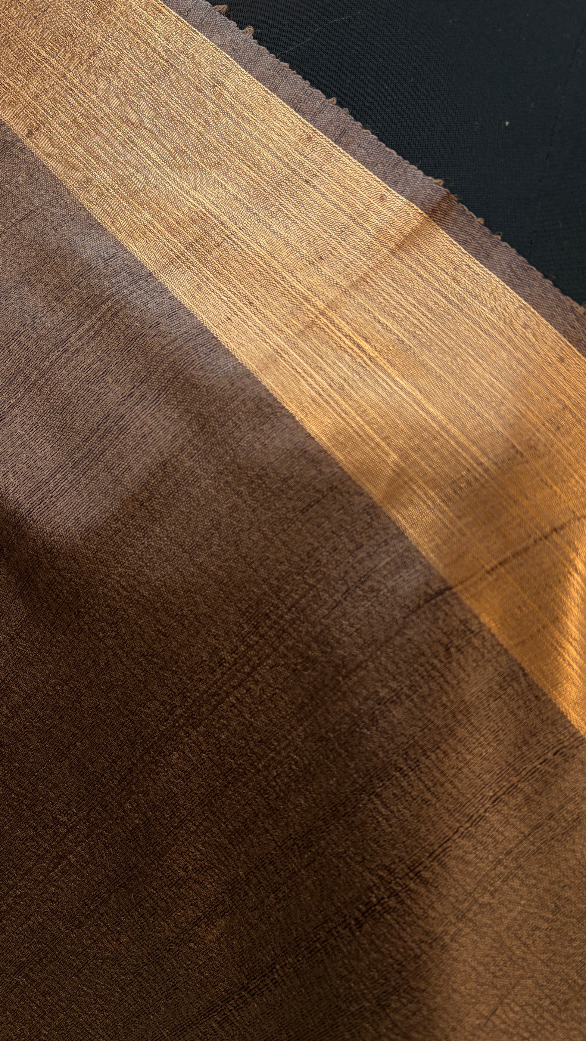 Rich, warm, and deeply inviting, this handwoven Tussar silk saree in brown is one that commands attention without trying too hard. Woven with care by skilled artisans, the gold zari stripes running through the fabric and the stunning solid gold zari pallu bring an earthy luxury that feels both timeless and refined.