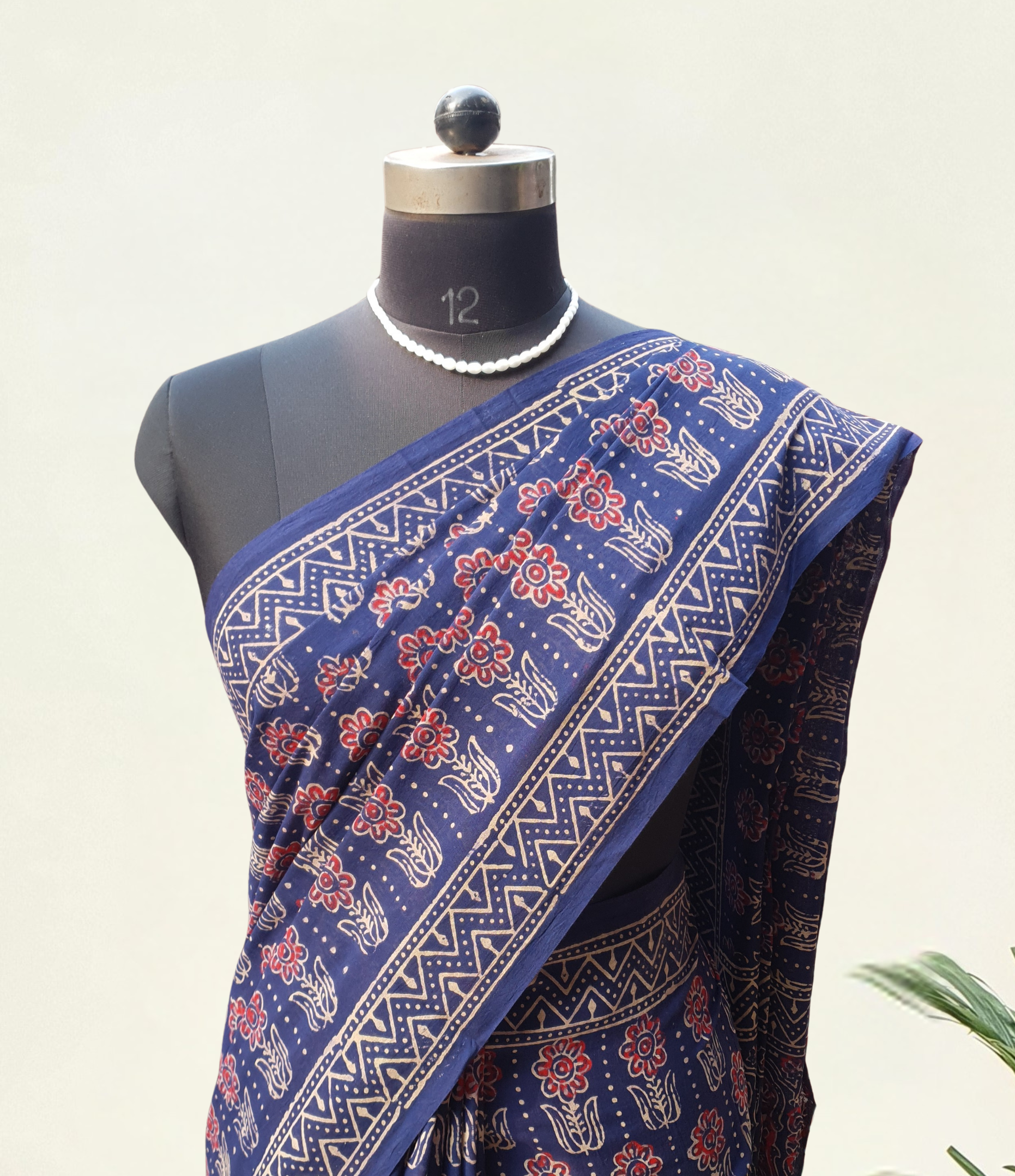 Expertly crafted from Mul Cotton, this Hand Block Print Saree showcases a beautiful Indigo hue. The intricate red floral design adds a touch of elegance, making it perfect for any occasion. Lightweight and comfortable, it's a must-have for your wardrobe.