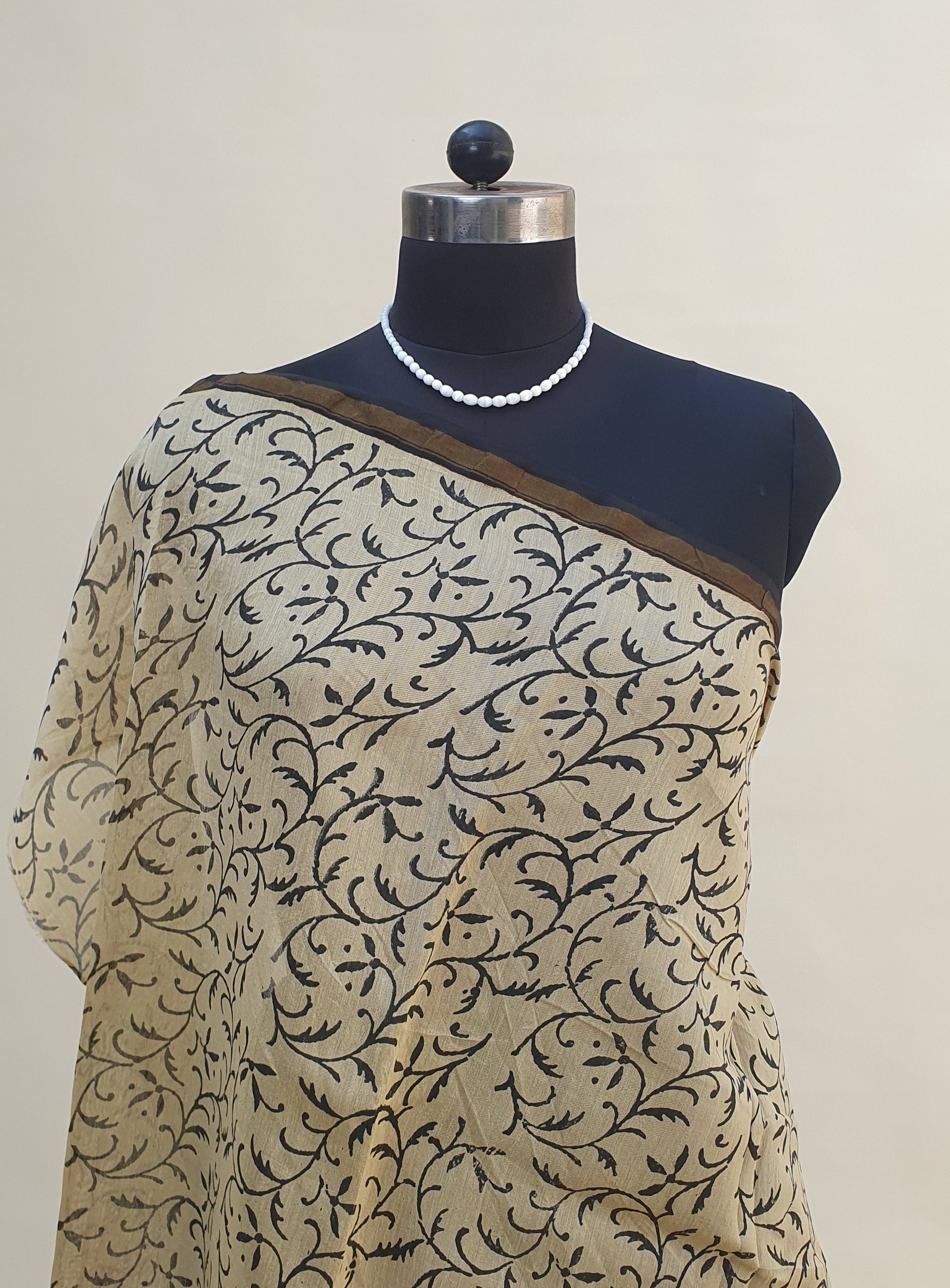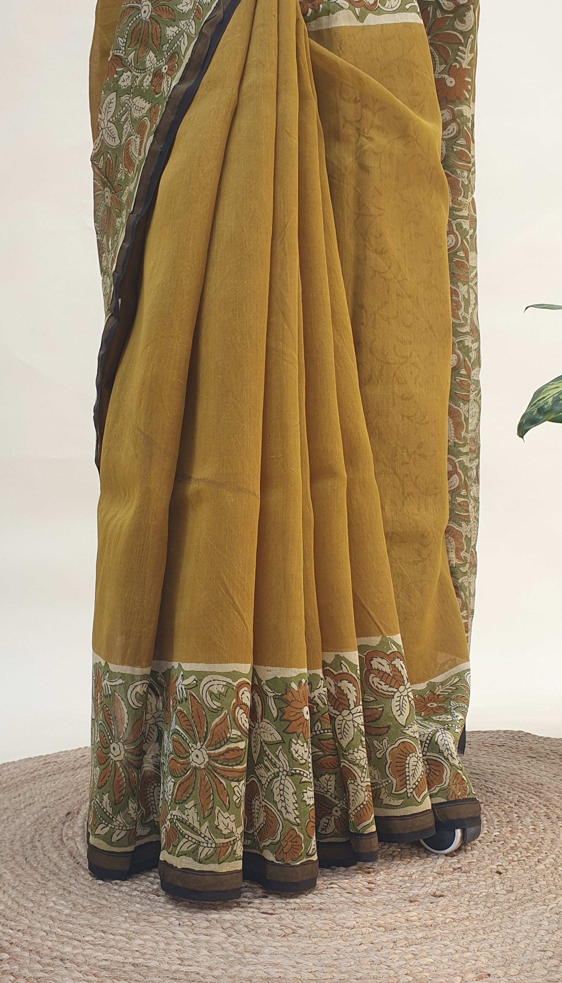 Rooted in heritage and wrapped in earthy elegance, the Kadamba Mustard Chanderi saree blends minimalism with intricate artistry. The body carries a rich mustard-gold hue with a subtle texture that gives it depth without overwhelming the eye. Along the borders and the pallu, hand-block floral motifs—reminiscent of classical Kalamkari—add character through warm browns, greens, and off-white detailing.