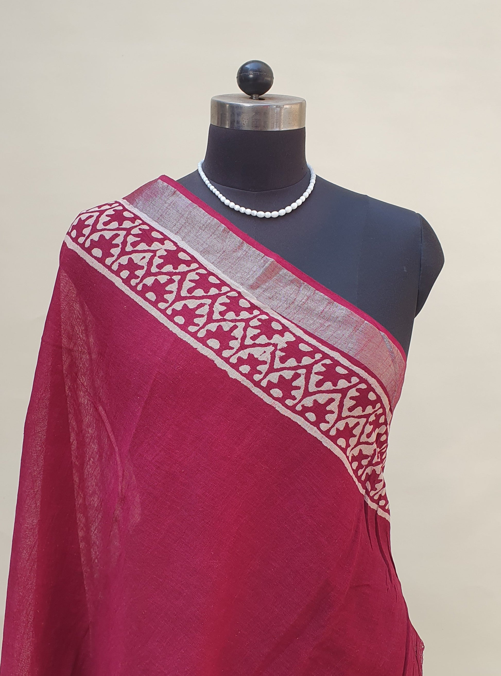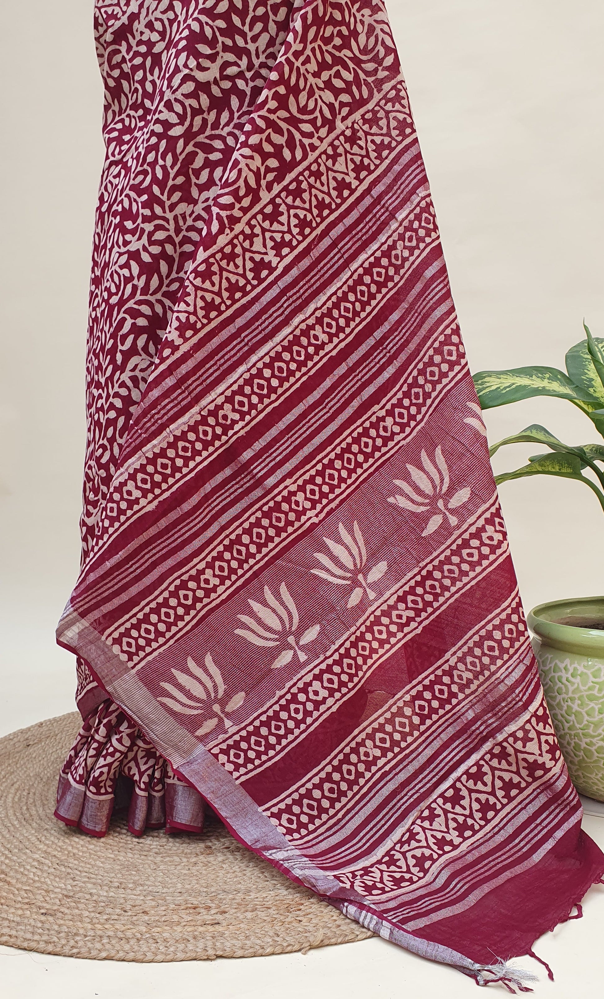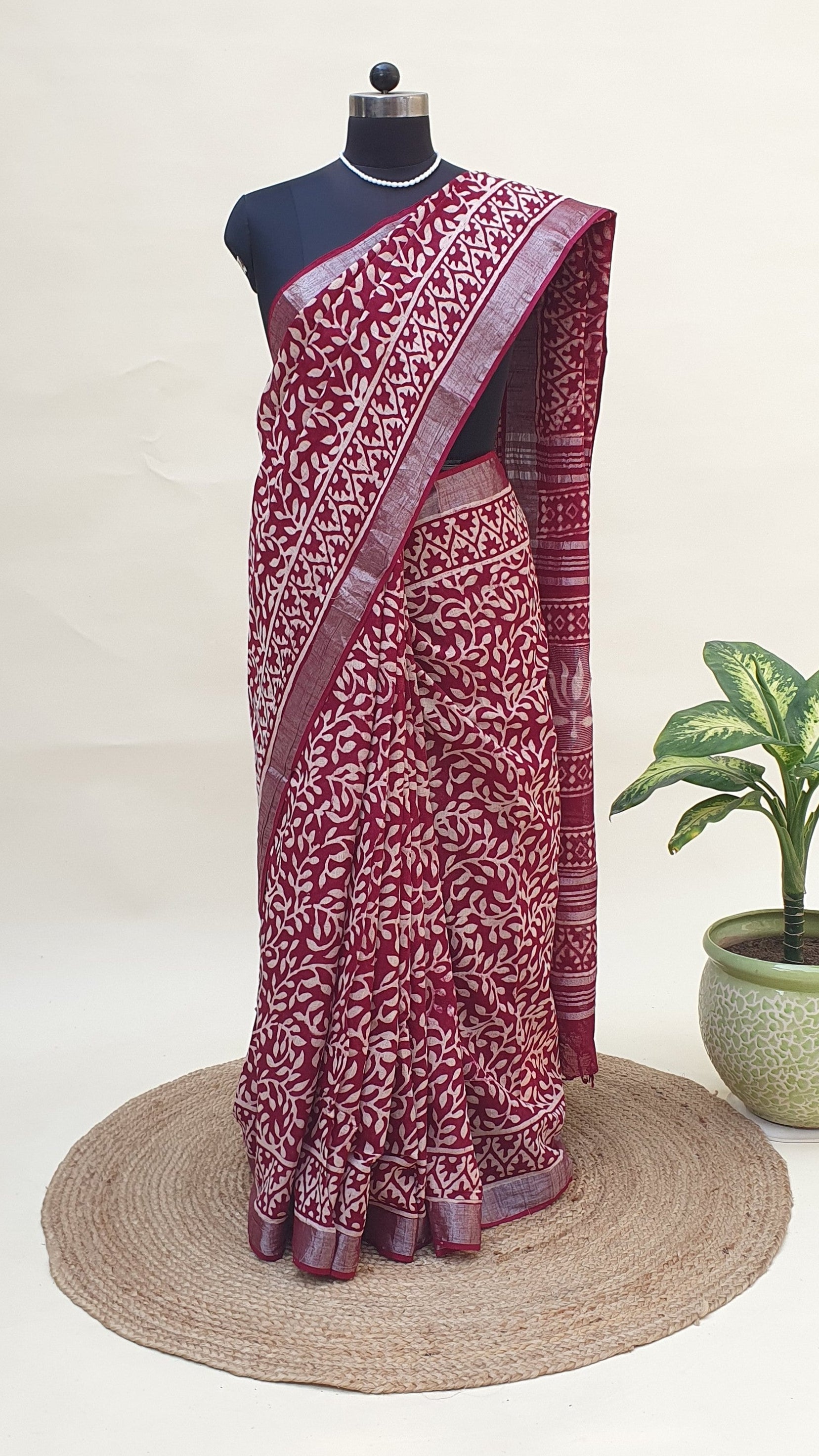 Crafted in pure linen, this saree brings together a crisp, breathable texture with a naturally elegant drape. Linen's moisture-wicking properties ensure all-day comfort, keeping you fresh even during long hours. The hand block printing uses natural dyes that lend the maroon a warm, earthy finish. Its effortless fall makes it easy to style and wear without any fuss.