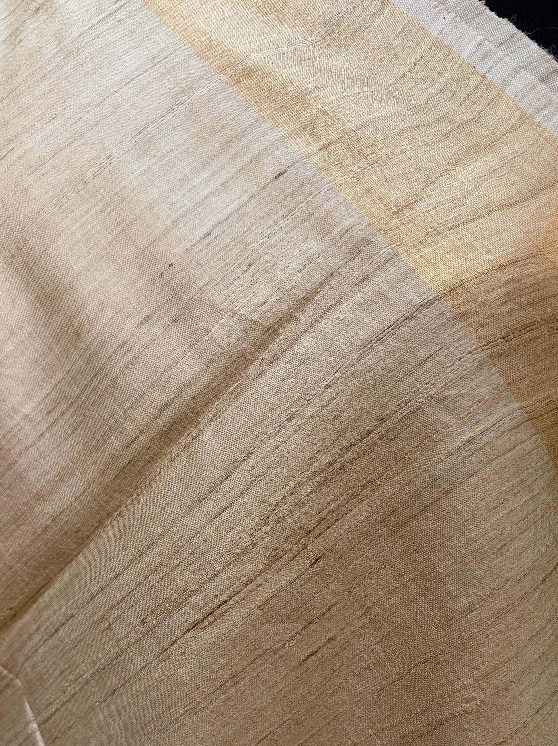 And then there is this one. A saree that looks like it walked straight out of a dream about simplicity. The base is pure natural Tussar, all soft creams and warm beiges blending into each other like sand and light. It could have stopped there and still been beautiful. But then comes that slash of magenta, and suddenly everything changes.