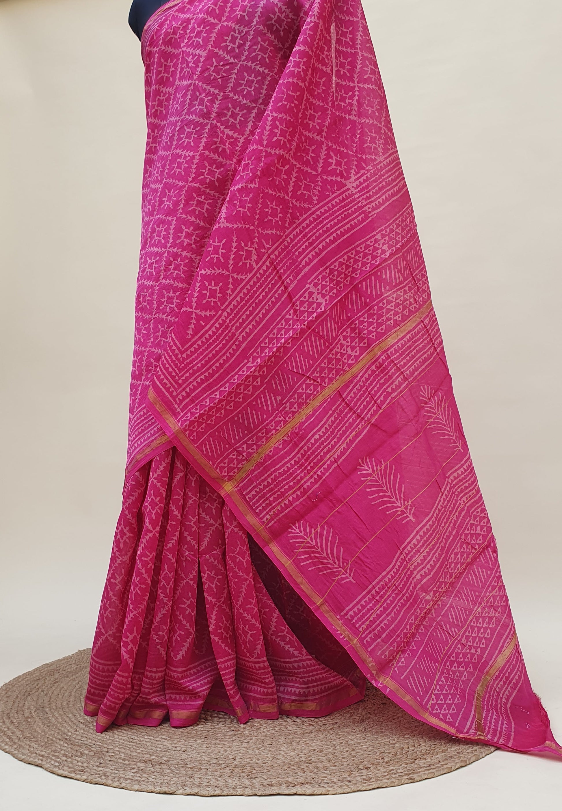 Elegant, radiant, and steeped in artisanal charm, the Padmini Pink Chanderi saree is a celebration of handcrafted beauty. Woven in a vibrant fuchsia-pink hue, the saree features delicate geometric block motifs that add a refined, modern rhythm to its traditional aesthetic.