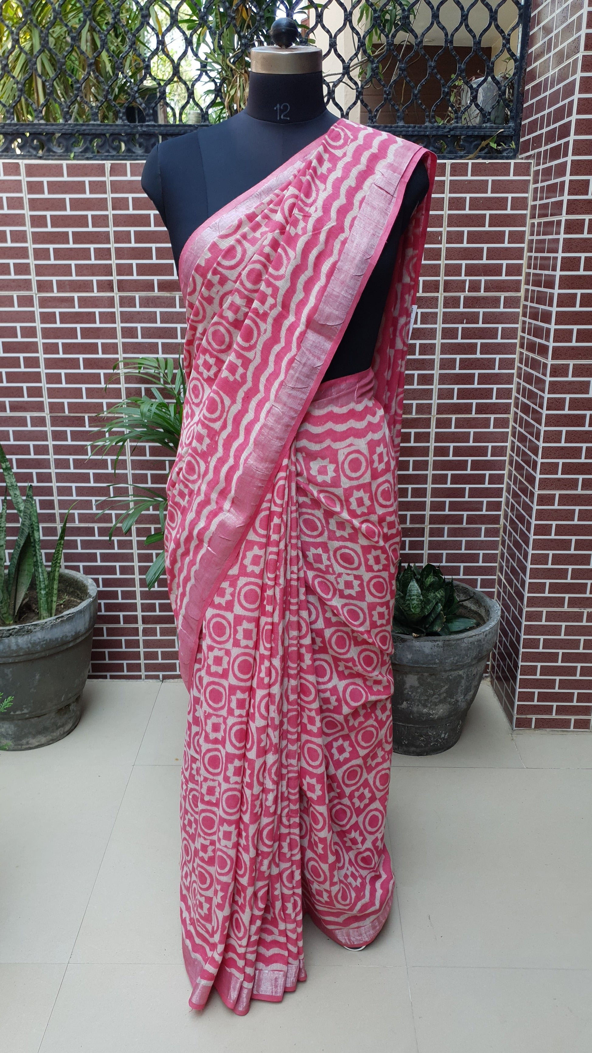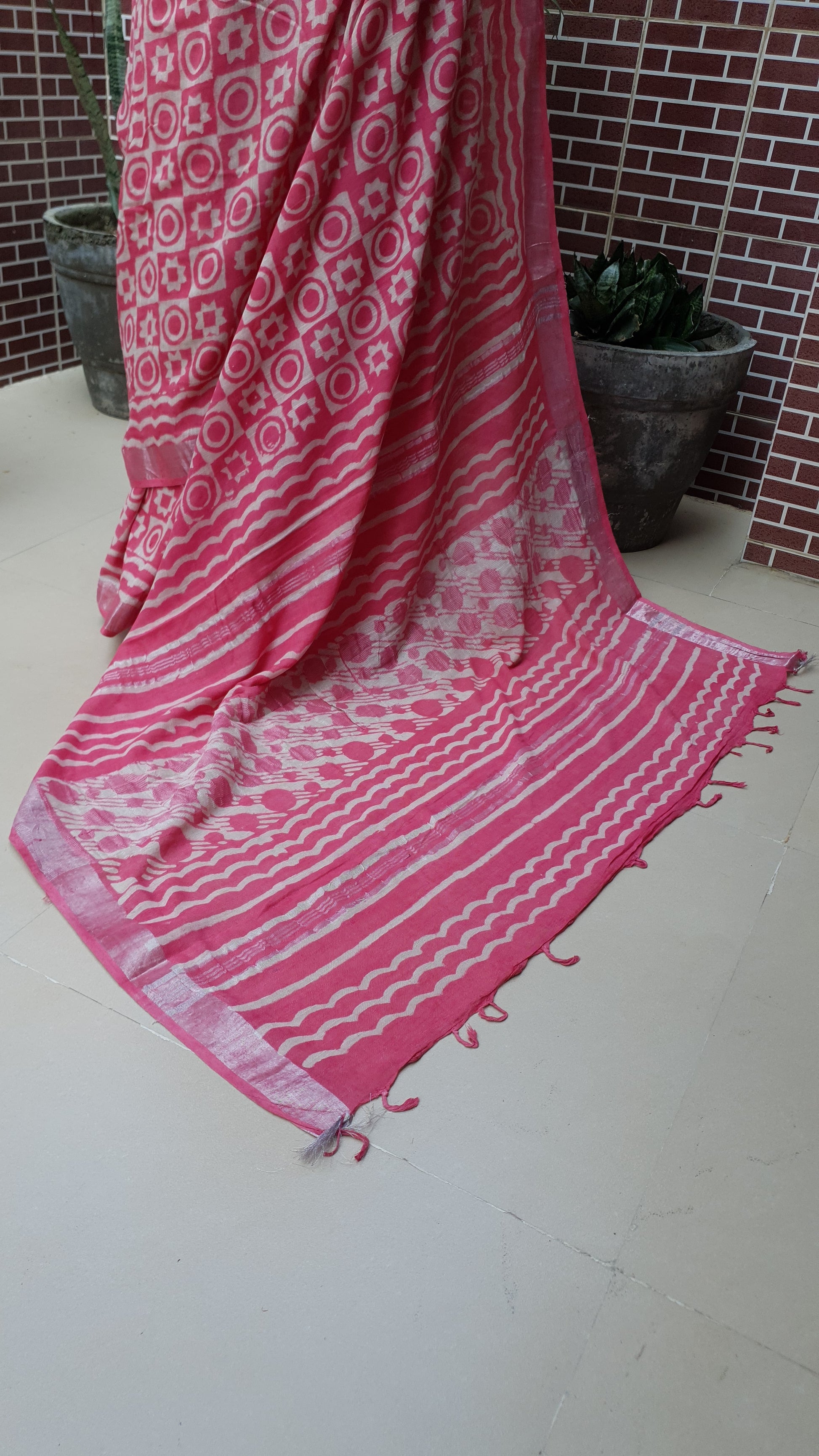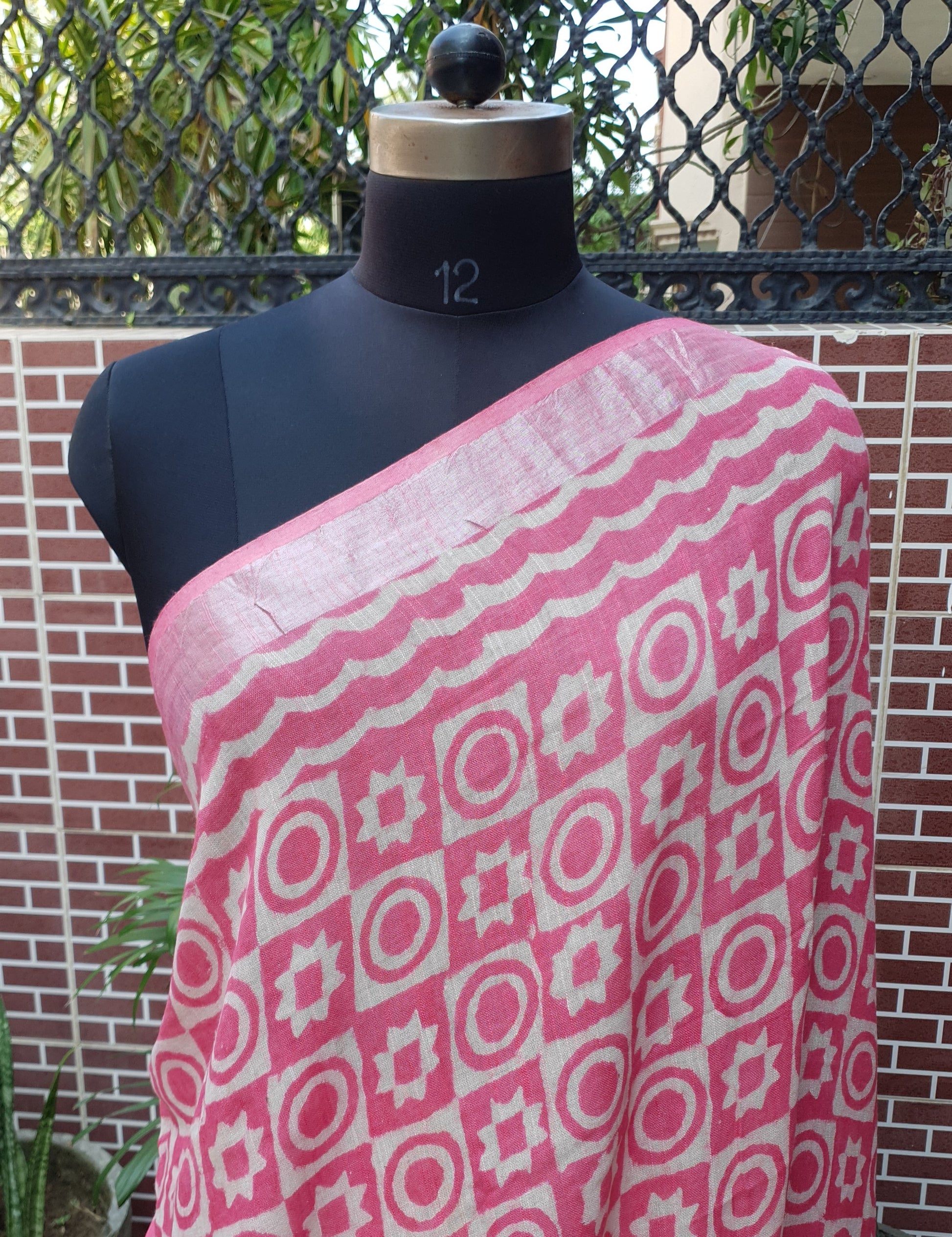 Expertly handcrafted, this Pink Linen Saree features a stunning hand block print design that adds a touch of sophistication to any outfit. Made from high-quality linen, it drapes beautifully and offers a comfortable and breathable wear. Perfect for any occasion, this saree is a must-have addition to your wardrobe.