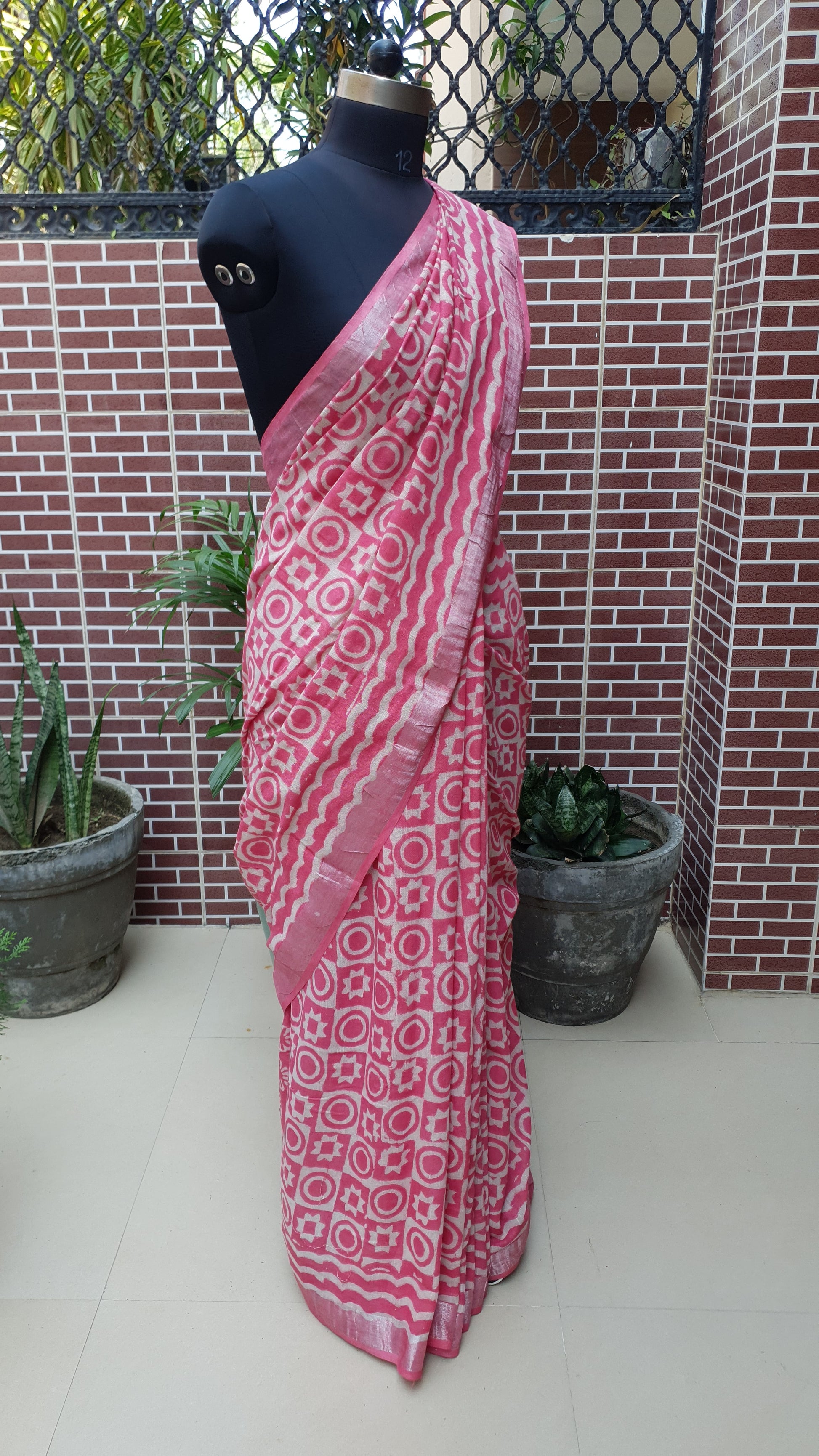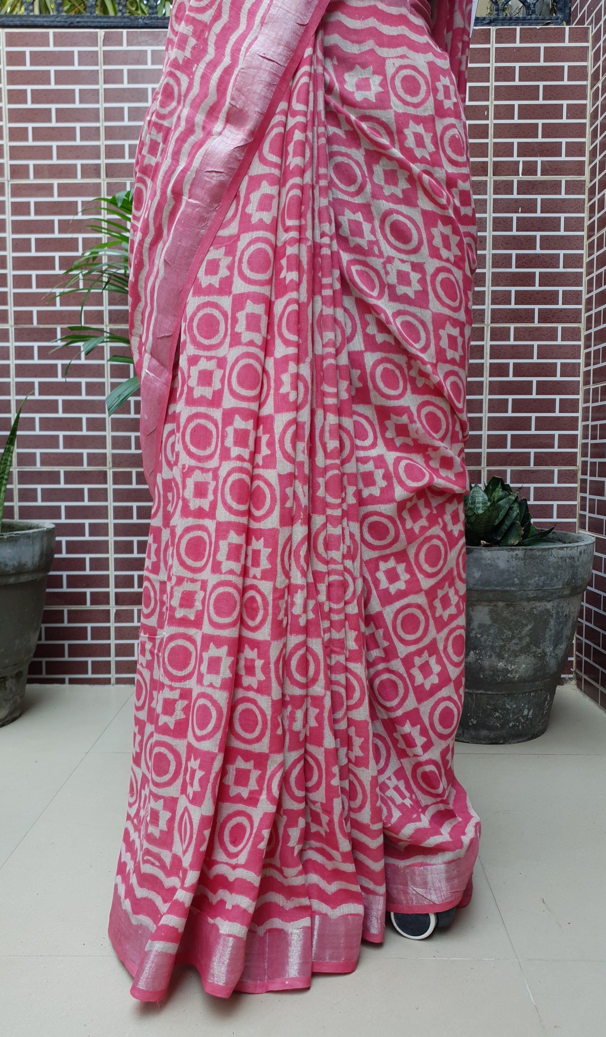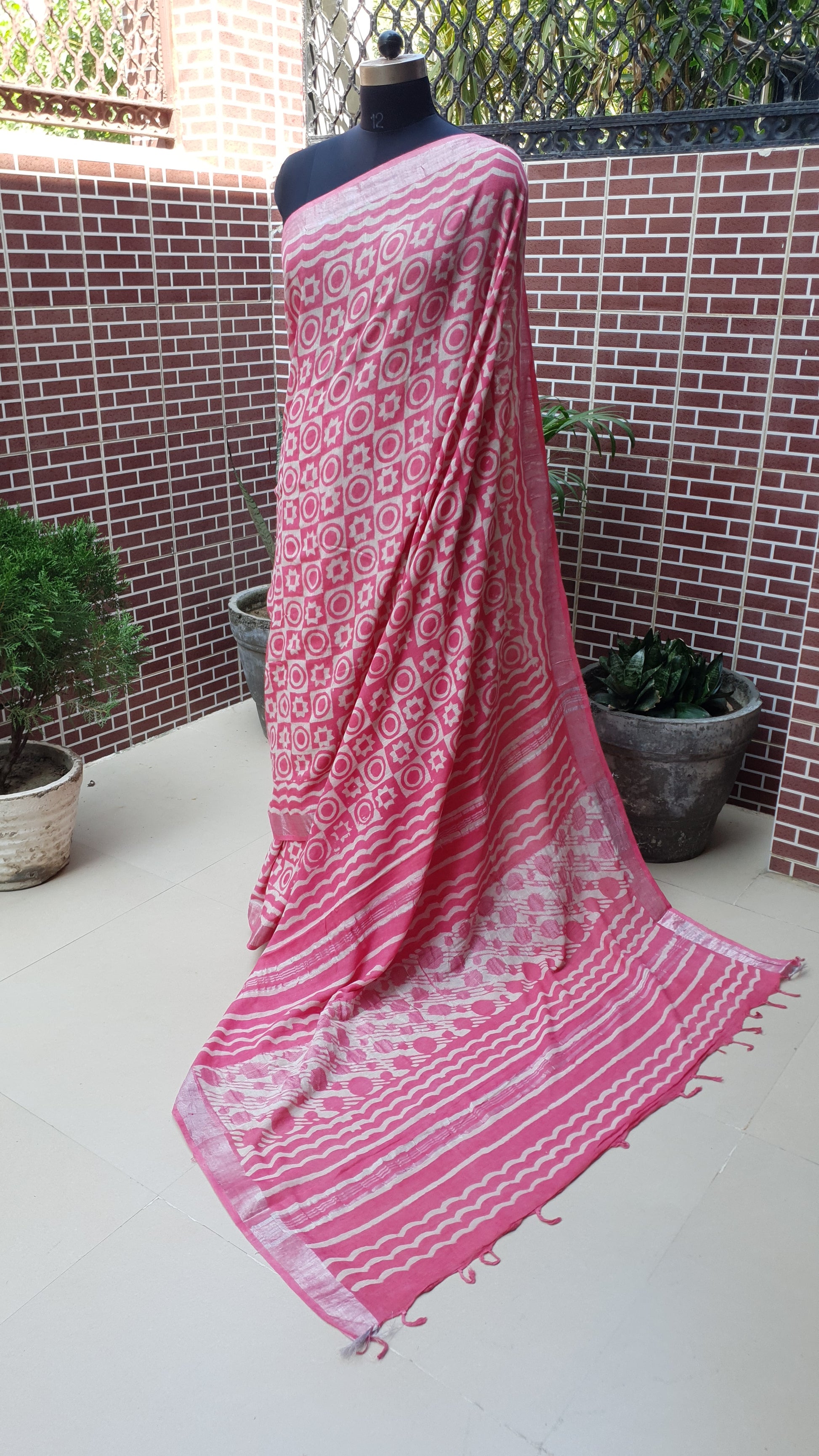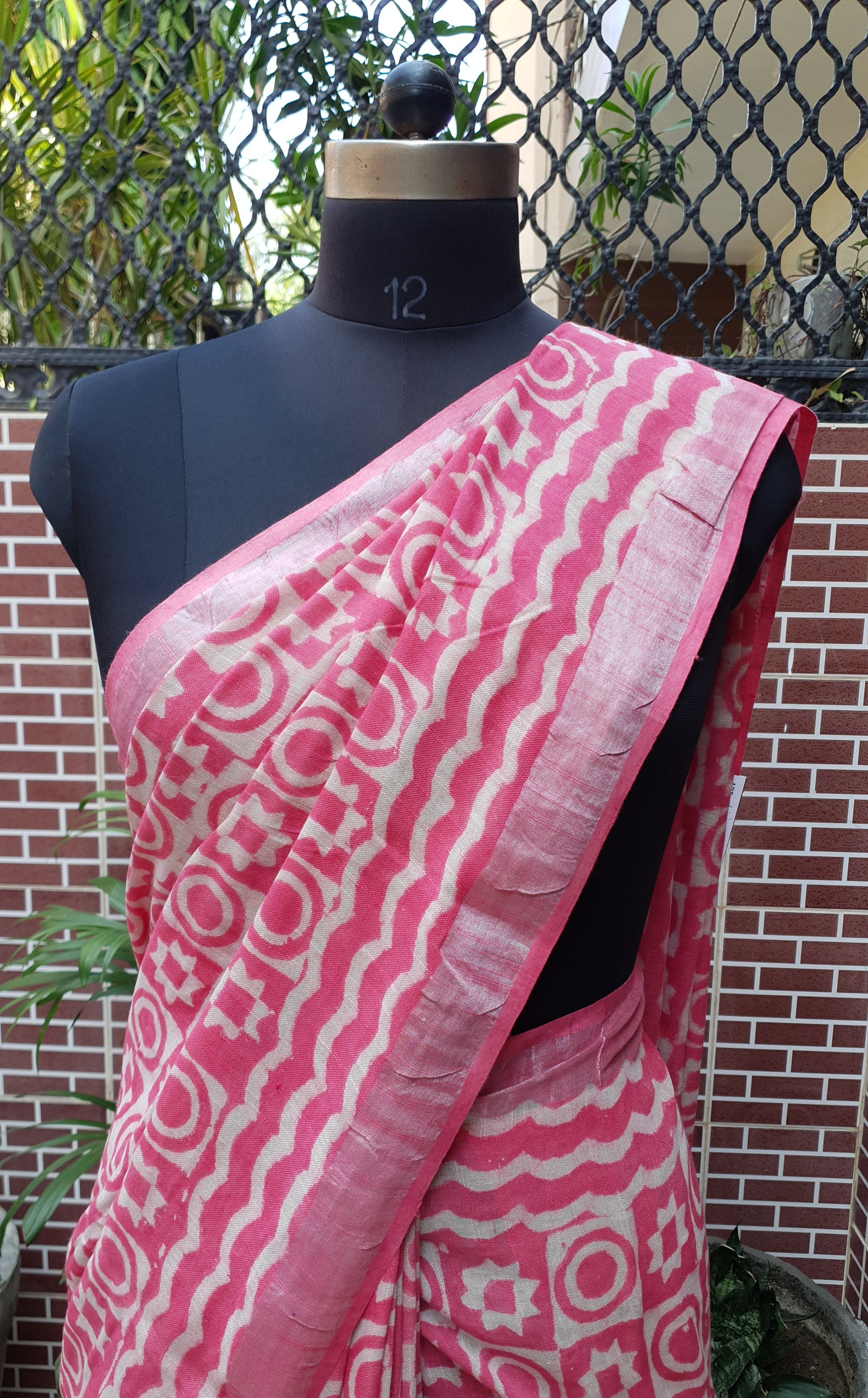 Expertly handcrafted, this Pink Linen Saree features a stunning hand block print design that adds a touch of sophistication to any outfit. Made from high-quality linen, it drapes beautifully and offers a comfortable and breathable wear. Perfect for any occasion, this saree is a must-have addition to your wardrobe.