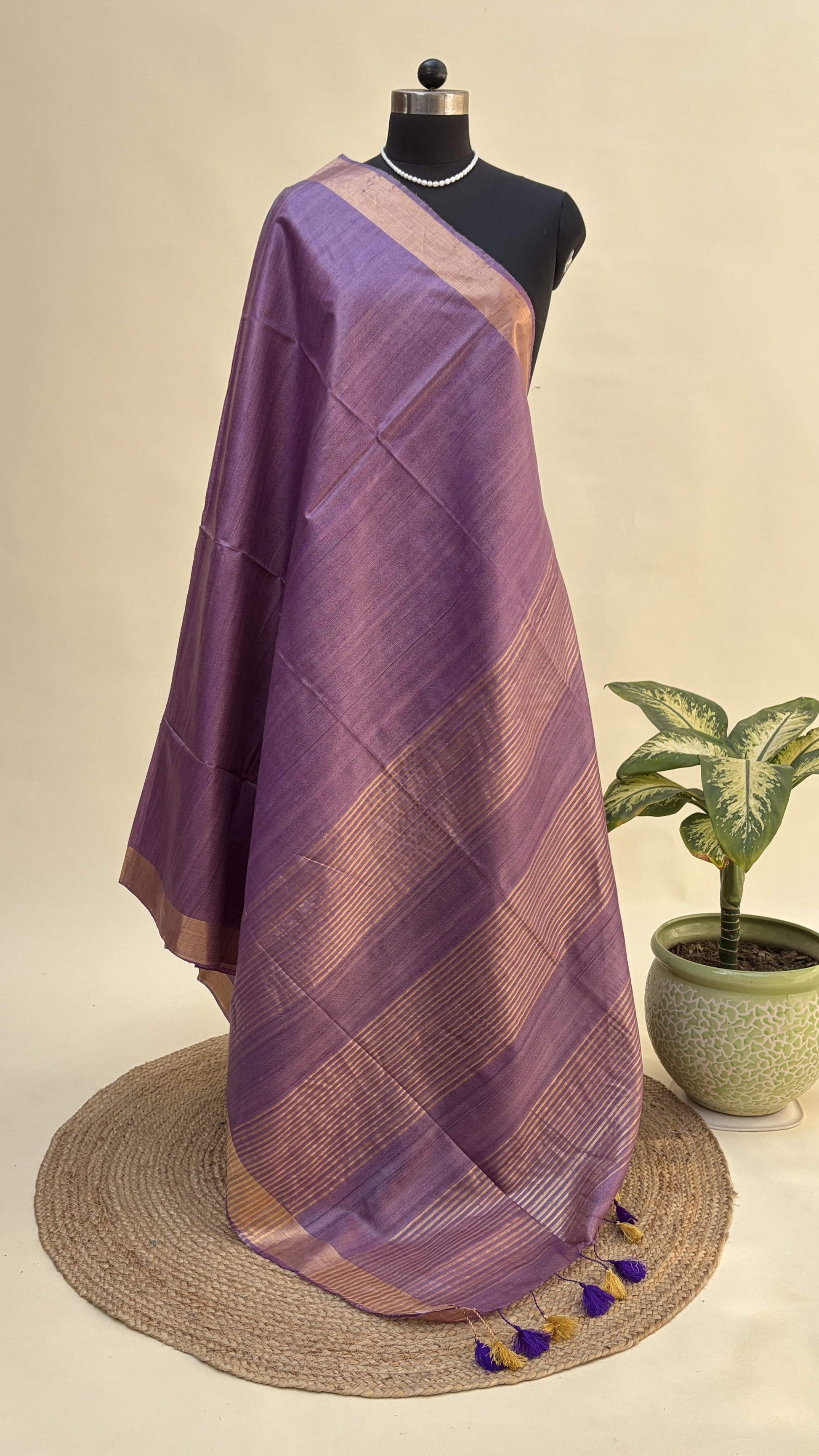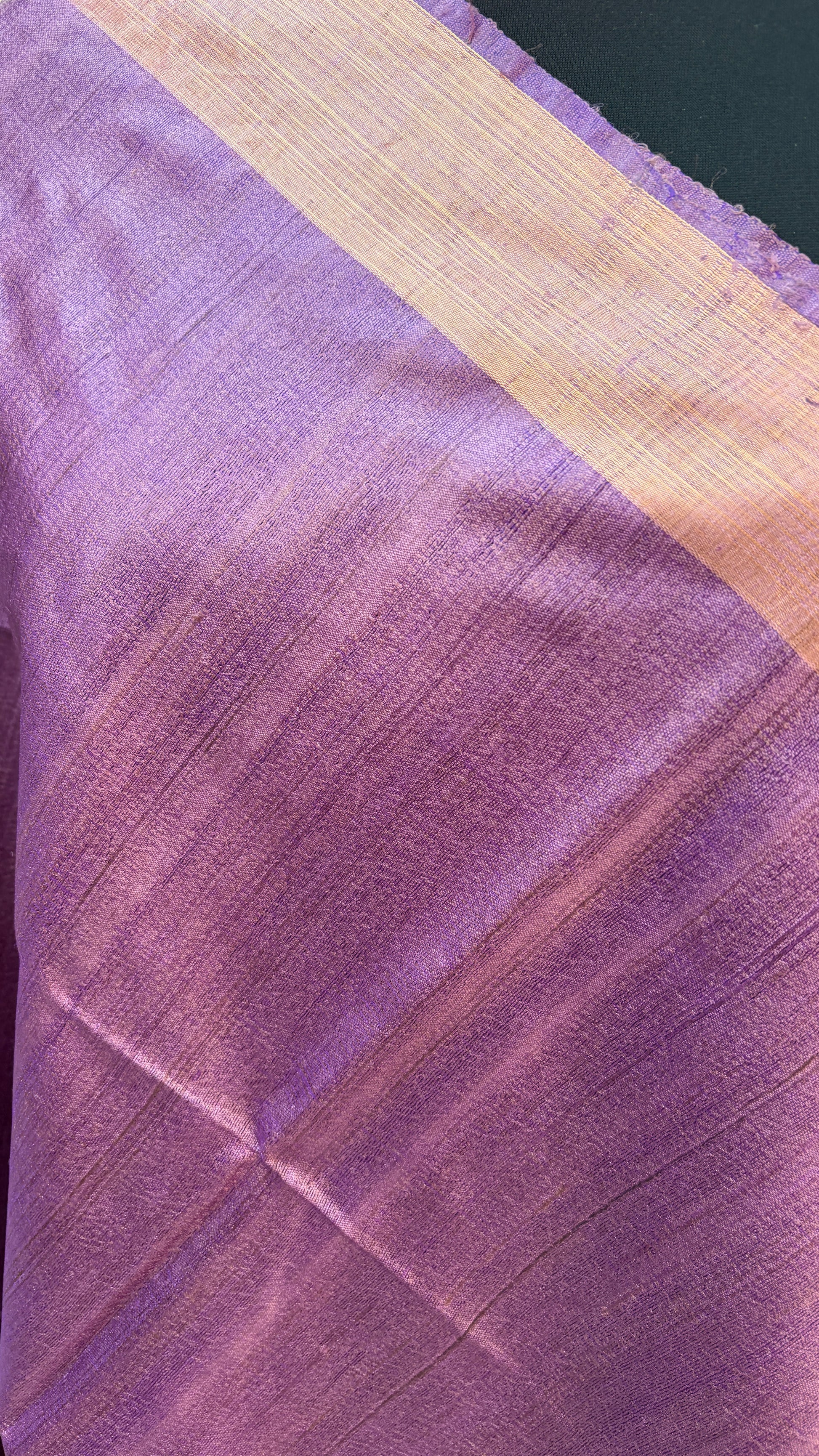 Not every piece needs to shout to be noticed. This handwoven Tussar silk saree in a dreamy shade of purple does quite the opposite. It draws you in gently, with its soft, almost velvety depth and the way the gold zari stripes shimmer quietly against the cool tones of the fabric.