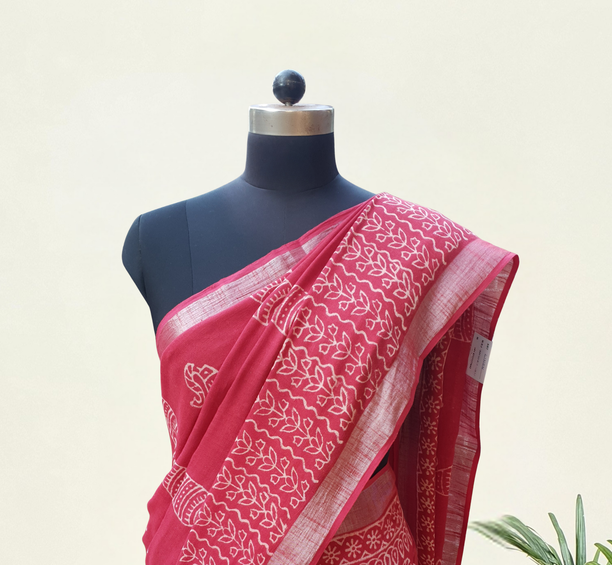 Get ready to turn heads with our Linen Saree! This vibrant red saree is adorned with a big paisley hand block print, adding a unique touch to this traditional piece. Made from comfortable and breathable linen, this saree will keep you looking and feeling cool all day long.