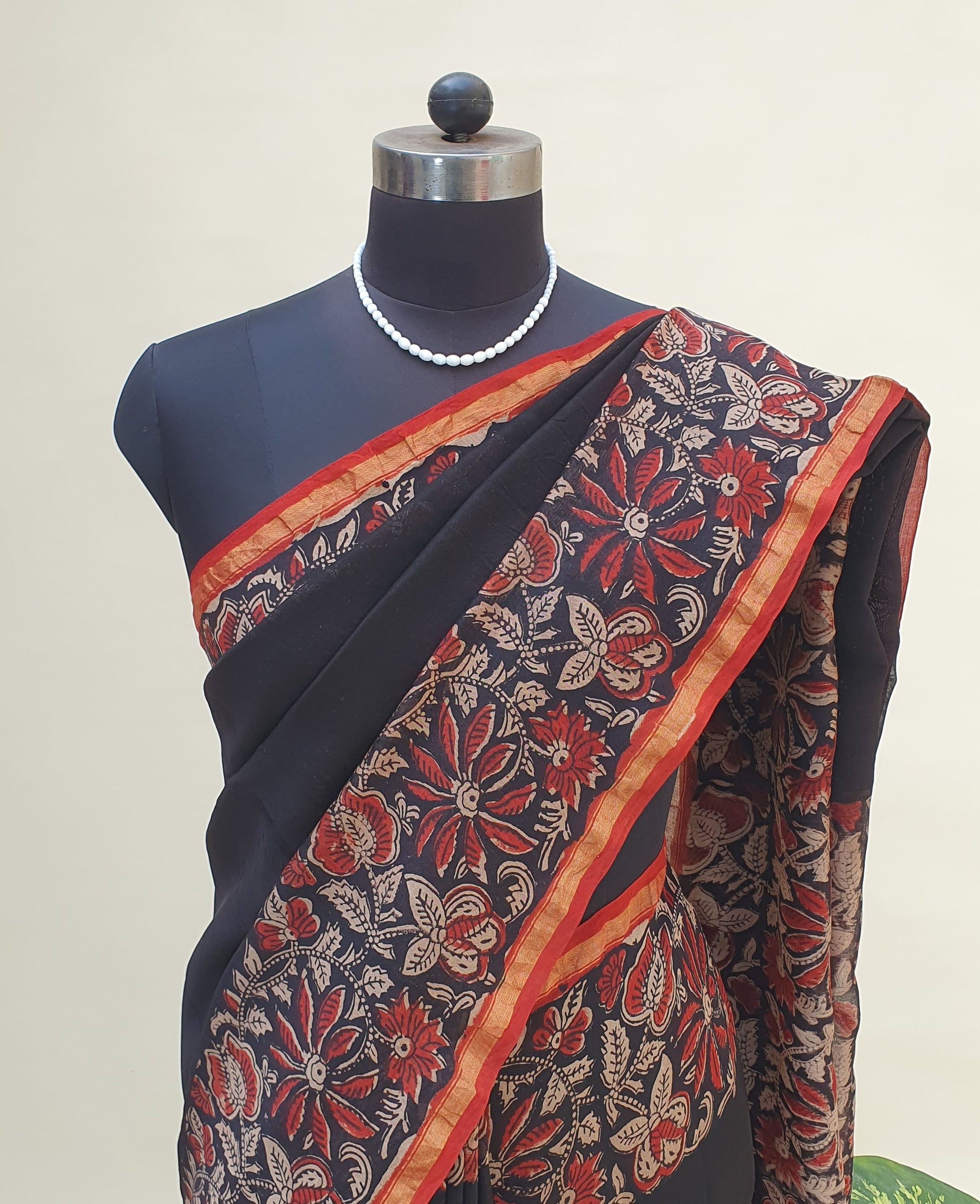 The body remains minimal and fluid, letting the intricate pallu bloom with hand-detailed motifs. Each flower and leaf carries the rustic charm of traditional block printing, giving the saree a rich, earthy warmth.