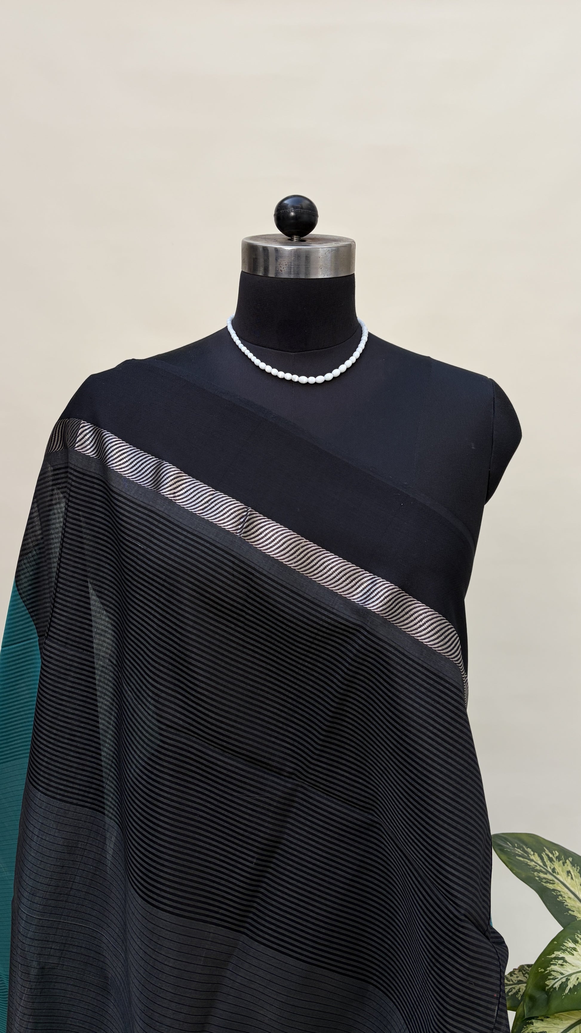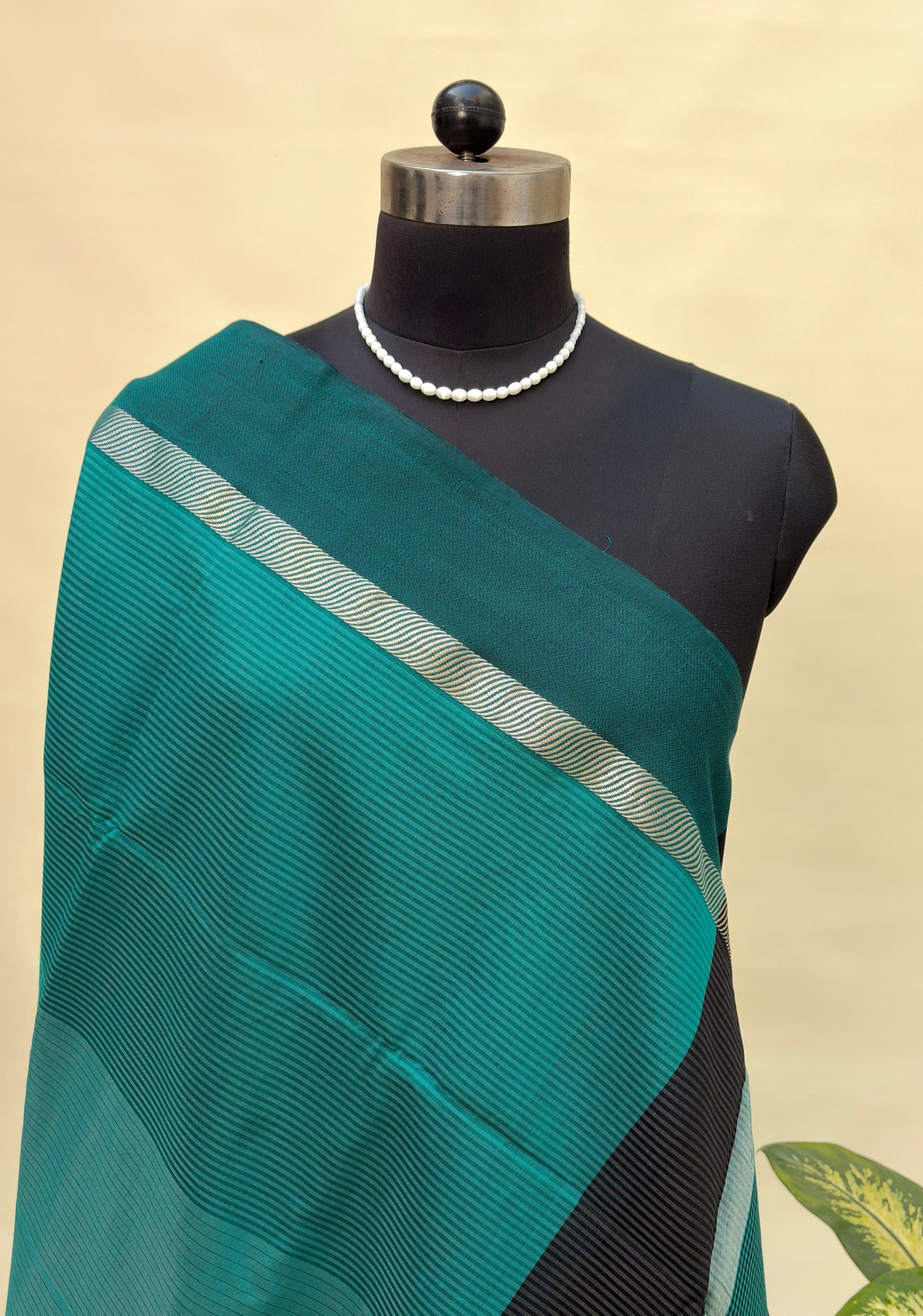 Teal that recalls deep water, grounded by charcoal. The body is woven in a saturated teal—Maheshwari's cotton-silk blend with a fine ribbed texture that creates dimension across the surface. The weave itself is the ornament here, no butas, no embellishment, just the integrity of parallel lines that shift and catch light as the fabric moves.