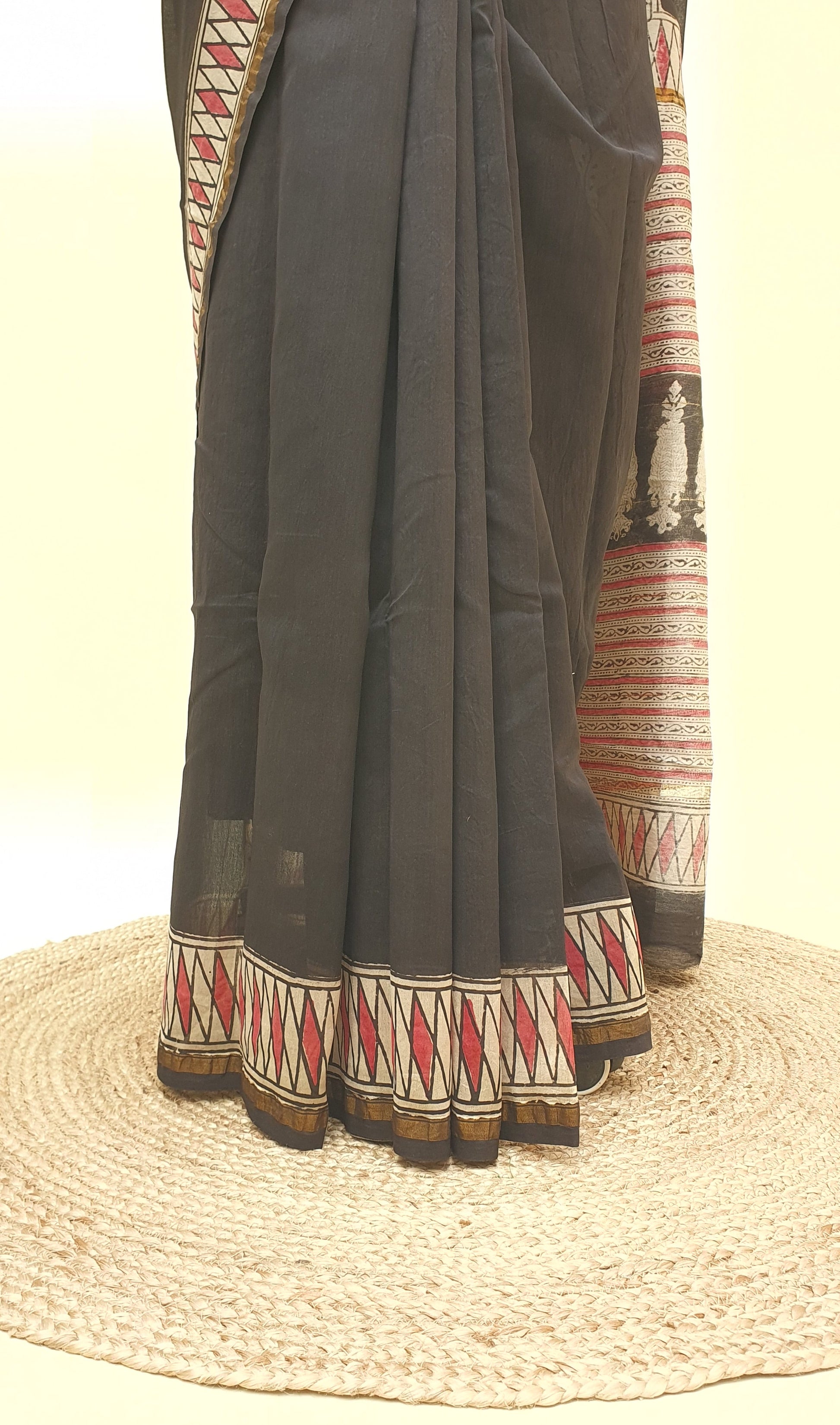 The geometric border — painted in warm reds, muted golds, and ivory — adds structure and rhythm to the drape. Paired with the pallu’s intricate linear and floral motifs, it creates a harmonious play of craft and pattern. Every segment speaks of thoughtful detailing rooted in Indian handwork traditions.