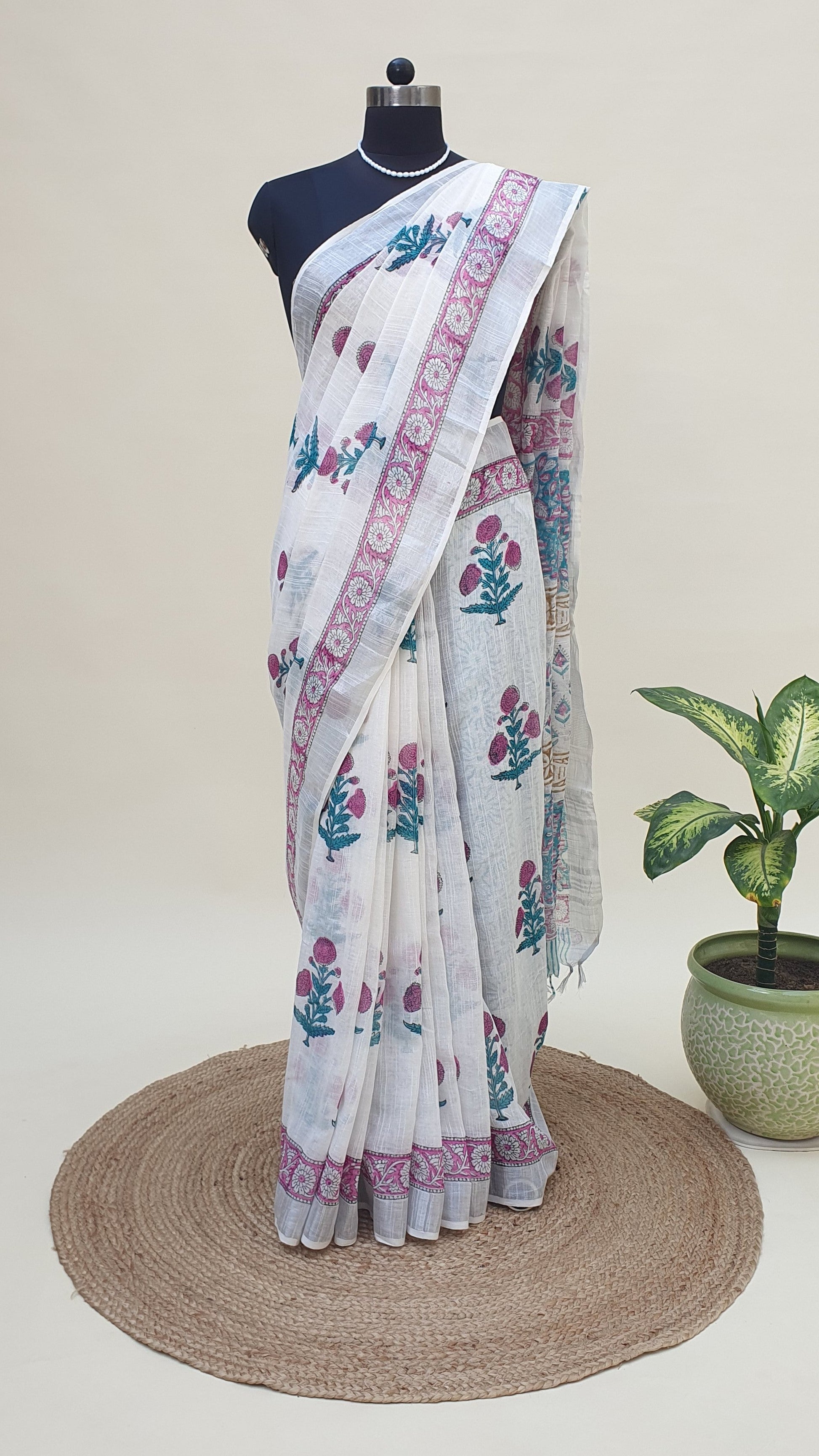 Woven in breathable linen fabric, the drape feels crisp, cool, and light through the day. The pallu features circular floral medallions, framed with a soft rose-pink and beige border, simple, graceful, and rooted in craft.
