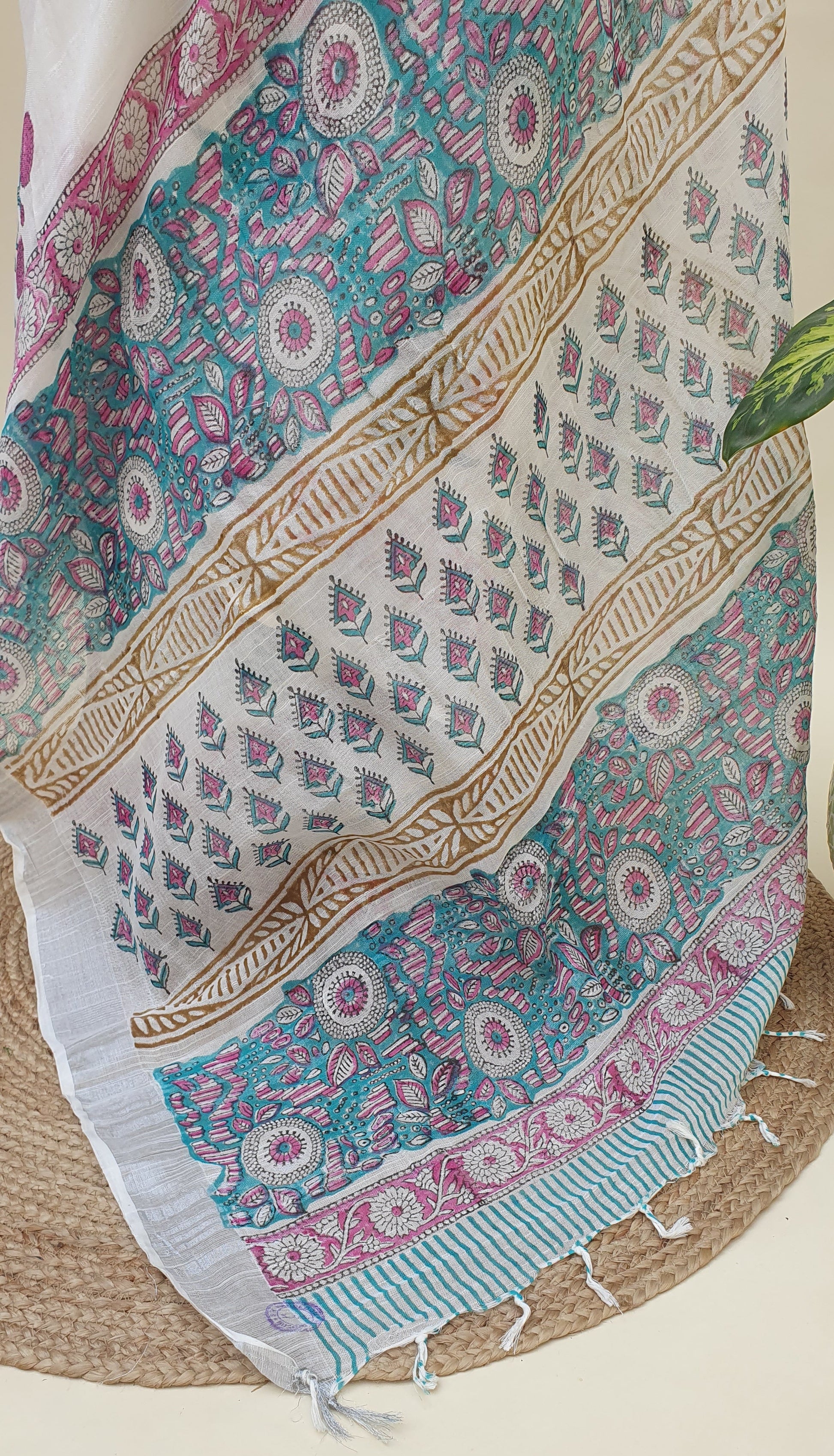 Urvi is a calm yet charming drape inspired by fresh mornings and effortless style. The saree carries a soft cream-white tone that feels natural, gentle, and easy on the eyes, perfect for looks that balance elegance with ease. Hand-block printed maroon thistle florals flow across the body in a clean, rhythmic layout, while teal-green stems and leaves add a refreshing touch that feels happy and composed. It’s soothing, classic, and carries a hint of festivity without trying too much.